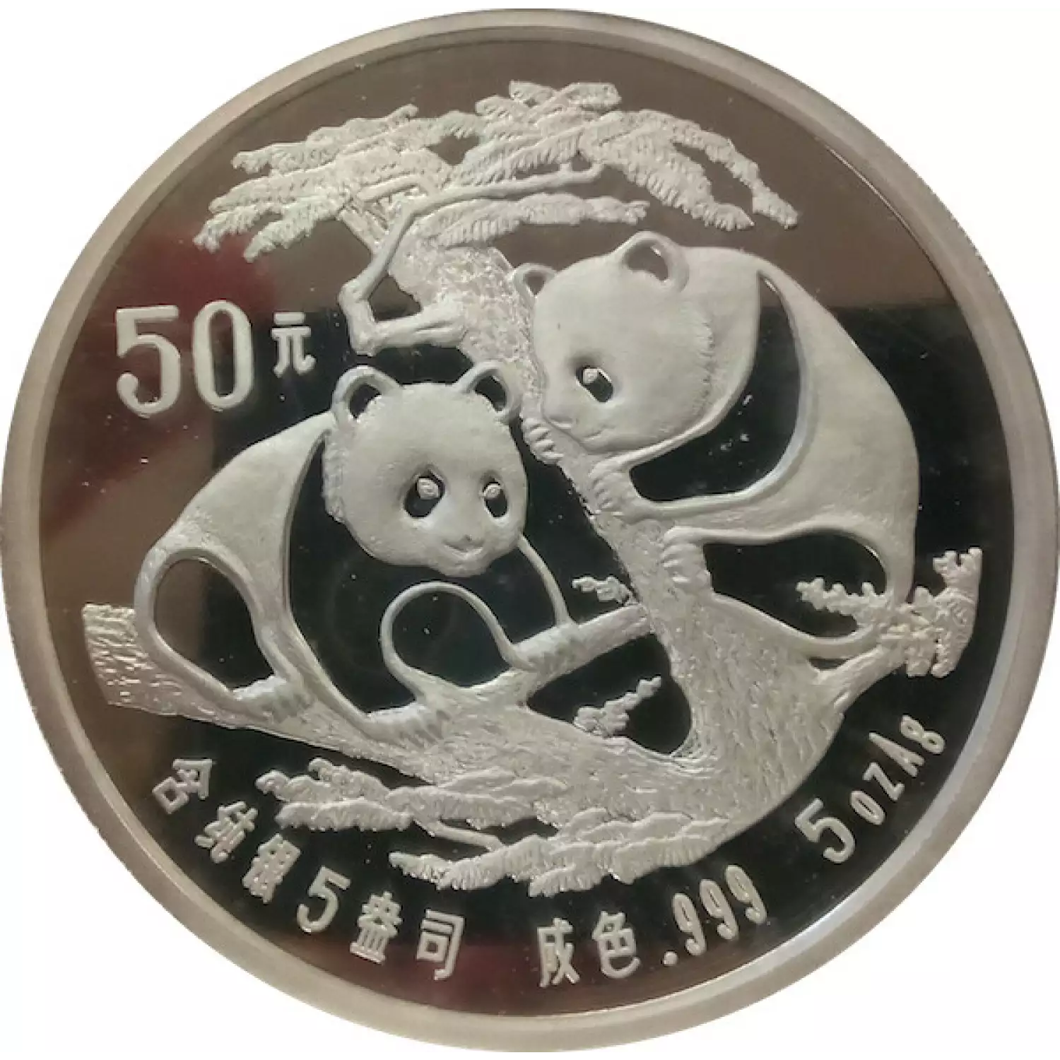 The Chinese Silver Panda Coins are one of the diverse, most popular silver bullion coins in the world. Silver Pandas have been produced since 1983, and have been minted in different denominations of 1/20 oz, 1/10 oz, 1/4 oz, 1/2 oz, and 1 oz. The 1988 5 oz Chinese Silver Panda is composed of 5 troy ounces of .999 fine silver and has a face value of 50 Yuan. The Reverse of the coin features two playful pandas in a tree.