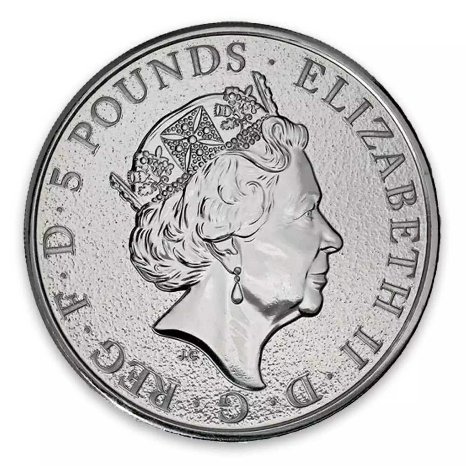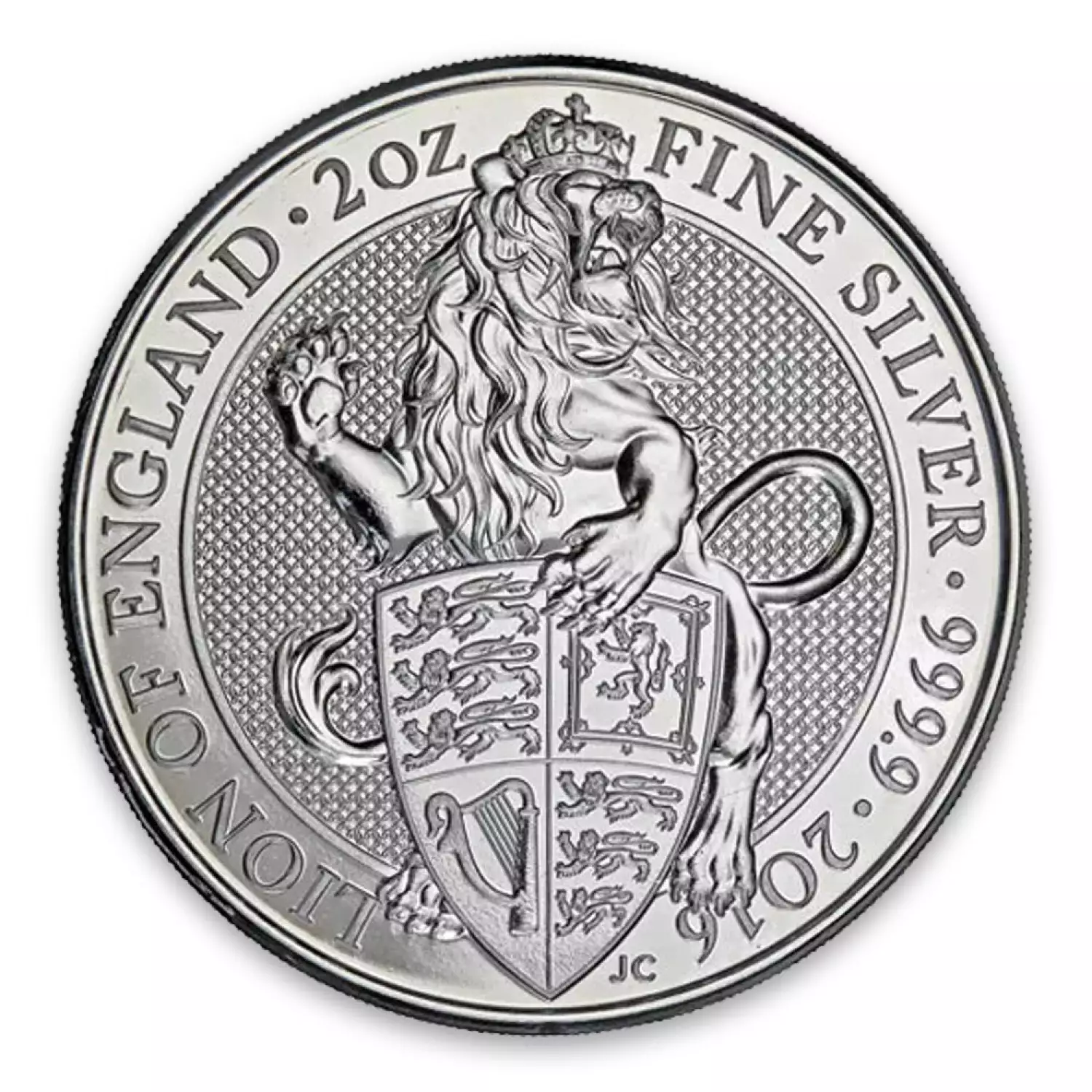 The Queen's Beasts series is UK legal tender and is produced by the Royal Mint. Each 2 oz 2016 Britain Queen's Beasts: The Lion is composed of 2 oz of .999 fine Silver. The obverse of the coin features the effigy of Her Majesty Queen Elizabeth II, along with the face value of 5 pounds. The reverse of the coin features the image of the Lion and Heraldic Shield of England.