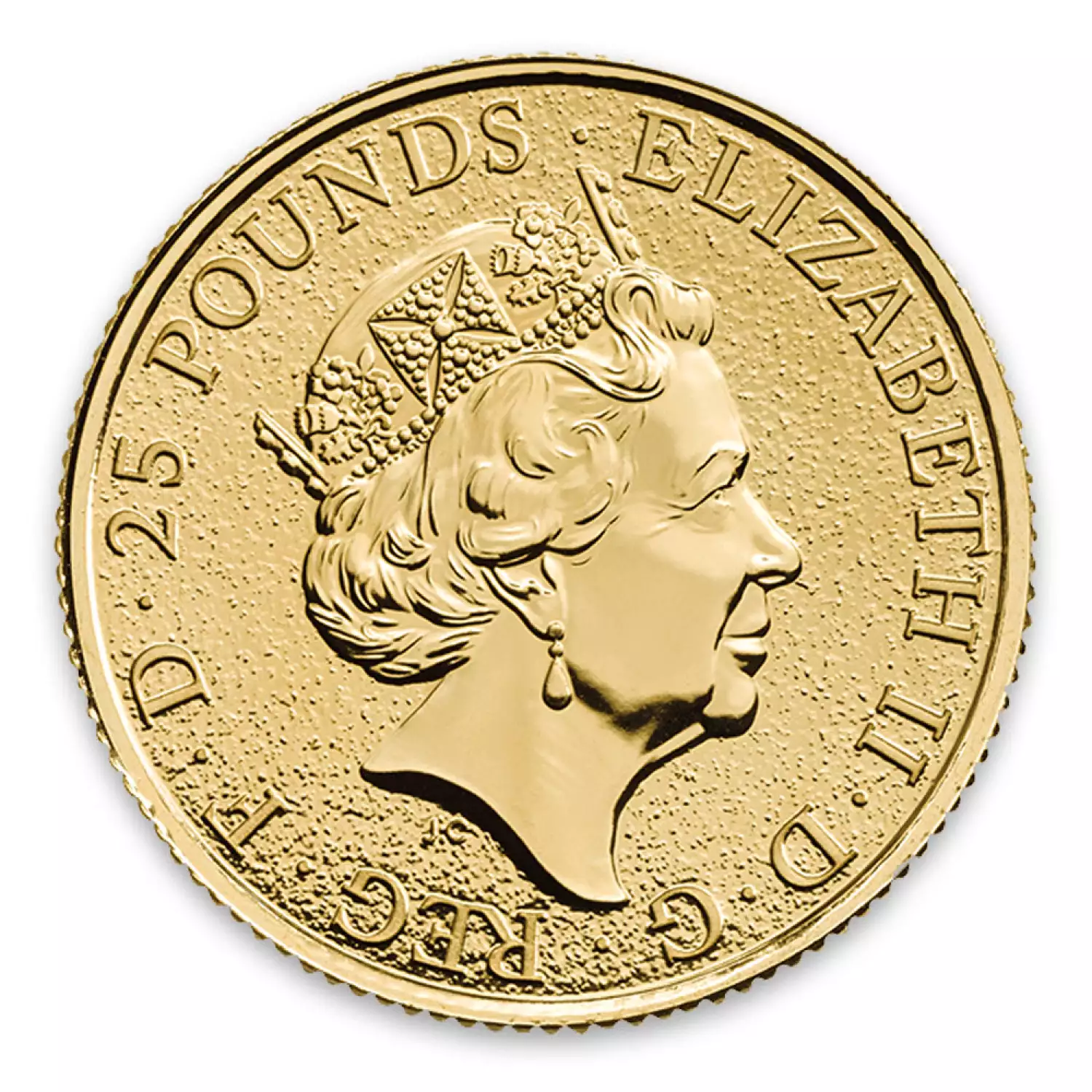 The 1/4 oz 2017 Britain Queen's Beasts: The Griffin is made of .9999 fine gold and weighs 0.25 Troy oz.